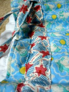 I confess I did buy fabric for this, even though I had plenty on hand that I could have used. I had been looking at some 30’s and 40’s reproduction print fabrics, but didn’t have a reason to buy any. So when this toy sack idea popped up they immediately came to mind. The fabric didn’t stay sitting around, that’s for sure. I didn’t have much time, so I only got to make two of them. I did use some white linen from the stash for the lining and I used some bias tape that was left over from a former quilt project…. so some stash and some new.